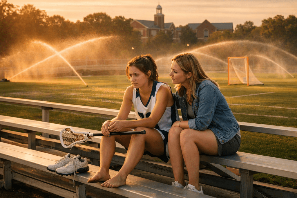The aluminum bleachers still held the day’s heat, metal warm against Sally’s bare legs as she peeled off her lacrosse cleats. Her stick lay abandoned beside her, the mesh pocket dark with sweat and afternoon shadows. Across the field, the sprinklers had begun their rhythmic dance, sending arcs of water across the scorched grass where she’d spent the last two hours running drills, trying to outpace the restlessness that had been building in her chest for weeks.