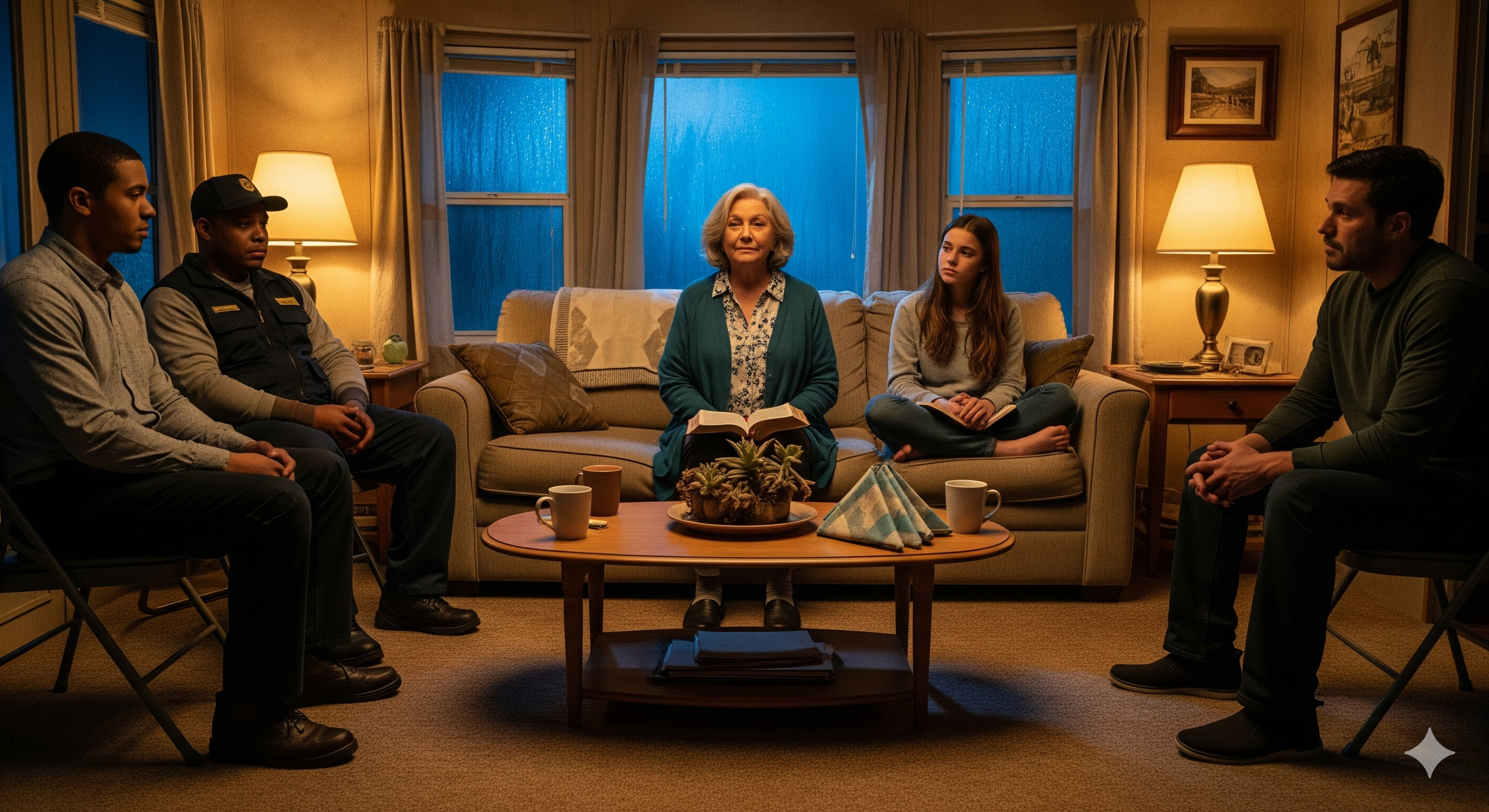 The rain had come early that evening, tapping the tin awnings of the Willow Pines Mobile Home Park like a quiet reminder that everything in this world was temporary. Inside Lot 27—a double-wide that smelled faintly of coffee, old hymnals, and last night’s fried tortillas—a small circle of folding chairs framed the living room. The carpet was worn where countless feet had traced the same hopeful path week after week.