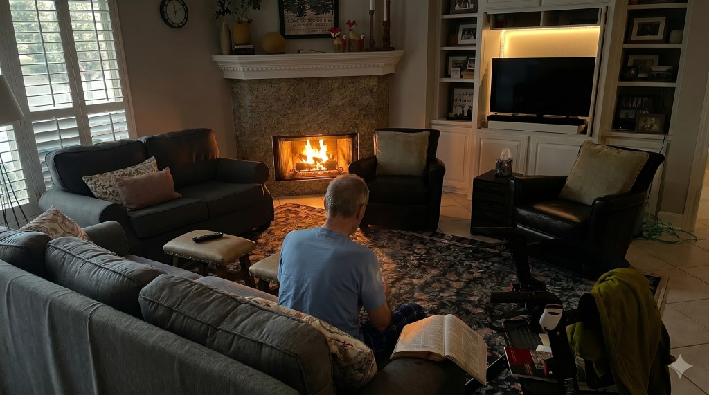 To my right, the built-in bookshelves glow under soft LED lighting, illuminating the faces of our sons, their wives, and our grandchildren. They are our heart’s legacy, framed in wood and glass, watching over me as I begin my morning ritual. My bare toes burrow into the intricate patterns of the Persian rug, the wool soft against my skin. There is a sense of groundedness here. Like Moses before the burning bush, I feel the weight of the moment. My feet are bare because this corner of the living room has become holy ground.