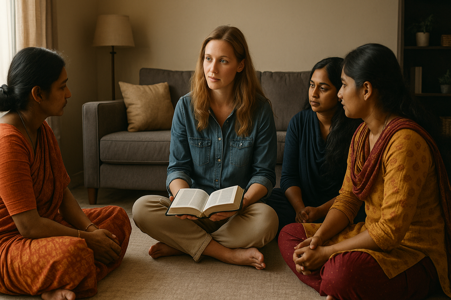 The apartment smelled of cardamom and cinnamon, a warm haze curling from the steaming chai in chipped ceramic cups. Sally sat cross-legged on a woven rug, her Bible open on her lap, its pages creased from years of thumbing. Across from her, three women—Fatima, Aisha, and Priya—nestled into mismatched cushions, their dark eyes flickering between curiosity and quiet skepticism. The late afternoon sun slanted through the window of Priya’s modest apartment, gilding the edges of a faded tapestry on the wall. A ceiling fan whirred lazily overhead, stirring the spiced air.